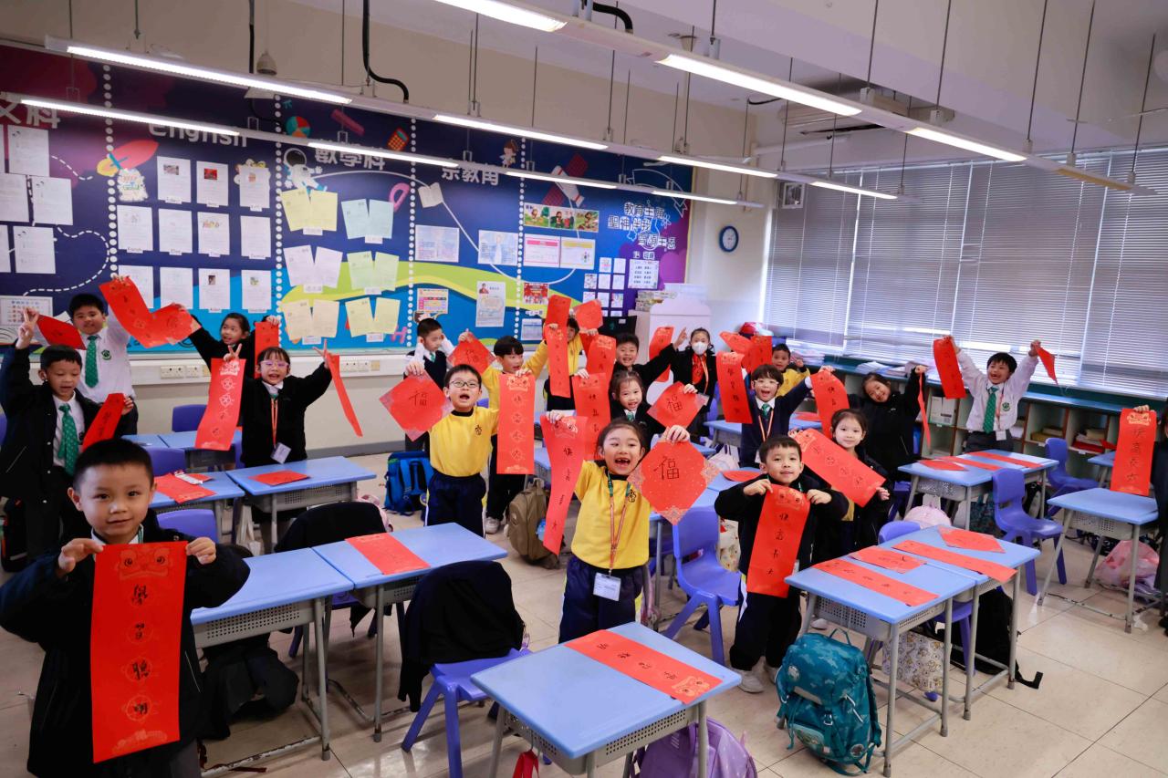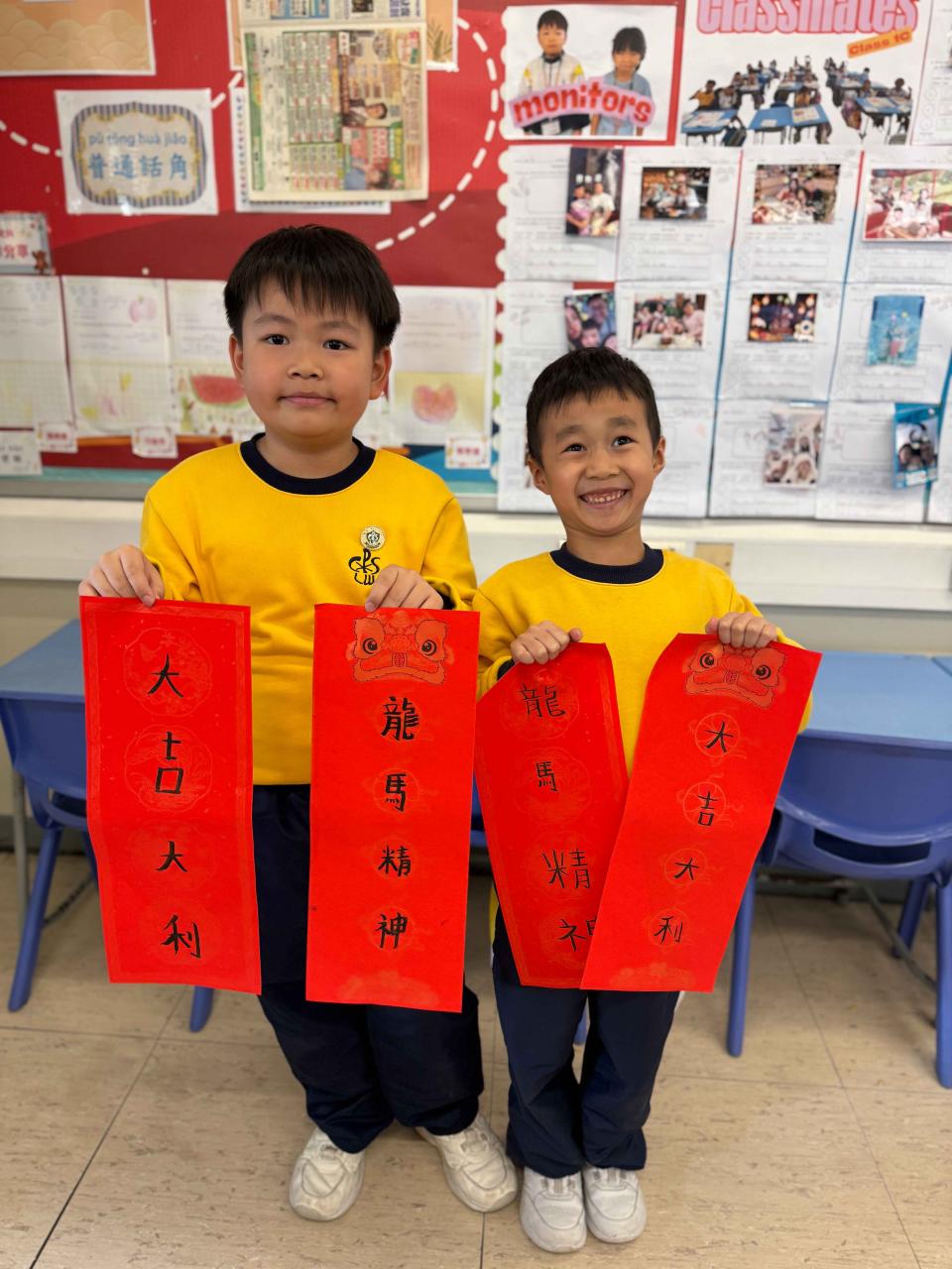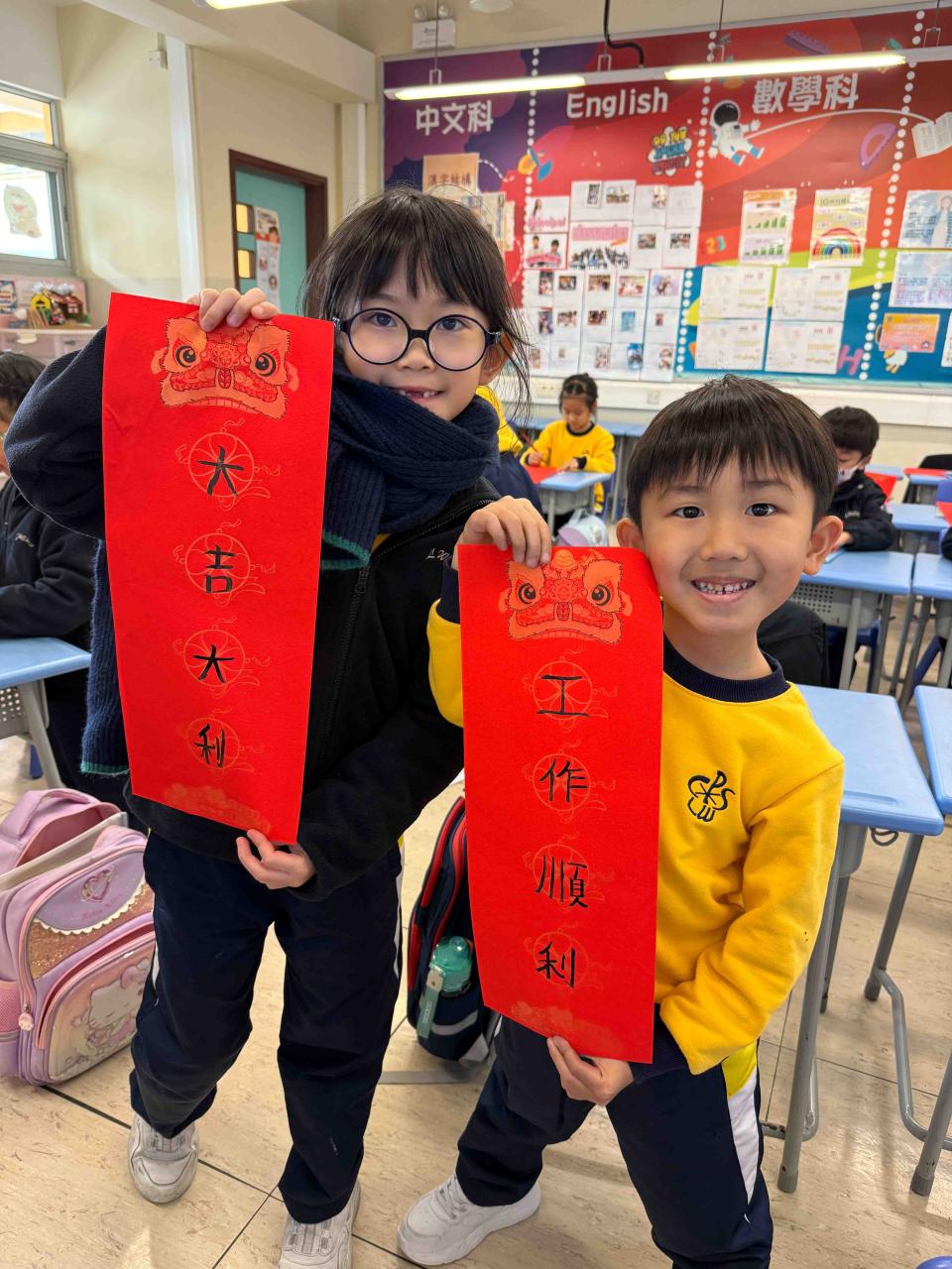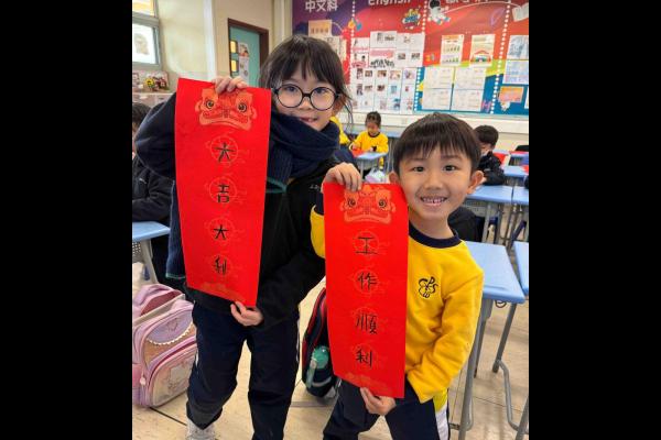 2026-01-26 農曆新年將至,校園洋溢着濃厚的節日氣氛。為了讓一年級學生感受傳統文化的魅力,本校於學滿FUN時段舉辦了製作揮春活動。在老師的悉心指導下,同學們首先認識了春聯的意義及「身體健康」、「學業進步」、「笑口常開」等祝福語,隨後便親手執筆揮毫,體驗書法的樂趣。在活動中,大家拿起毛筆時個個神情專注,一筆一畫寫下對新一年的美好期盼。活動不僅讓學生體驗到中國傳統藝術,更讓他們明白春聯背後承載的心願。在此,祝願各位家長和同學新春快樂,萬事如意,主恩滿溢!