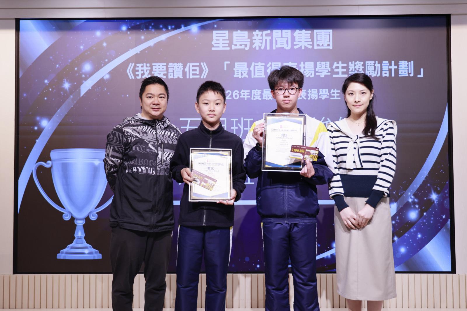 本校5A班周峻億同學及6C班梁睿熙同學榮獲星島新聞集團「最值得表揚學生獎勵計劃」之「我要讚佢大使」殊榮,並獲頒證書及書券以示鼓勵。兩位同學以實際行動獲得嘉許,充分展現優秀學生的典範——卓越不僅體現在學業成績上,更彰顯於日常生活中樂於助人、關愛他人的良好品格。