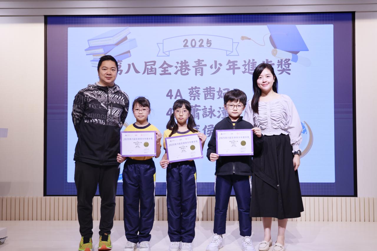 本校推薦李欣蒨同學(6A)、陳欣彤同學(6A)和周文傑同學(6B)參加「2018第四屆全港青少年進步獎」獎勵計劃,其中李欣蒨同學(6A)成功獲得「2018第四屆全港青少年進步獎」及獎學金1000元正,陳欣彤同學和周文傑同學則成功獲得進步嘉許獎。