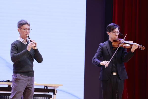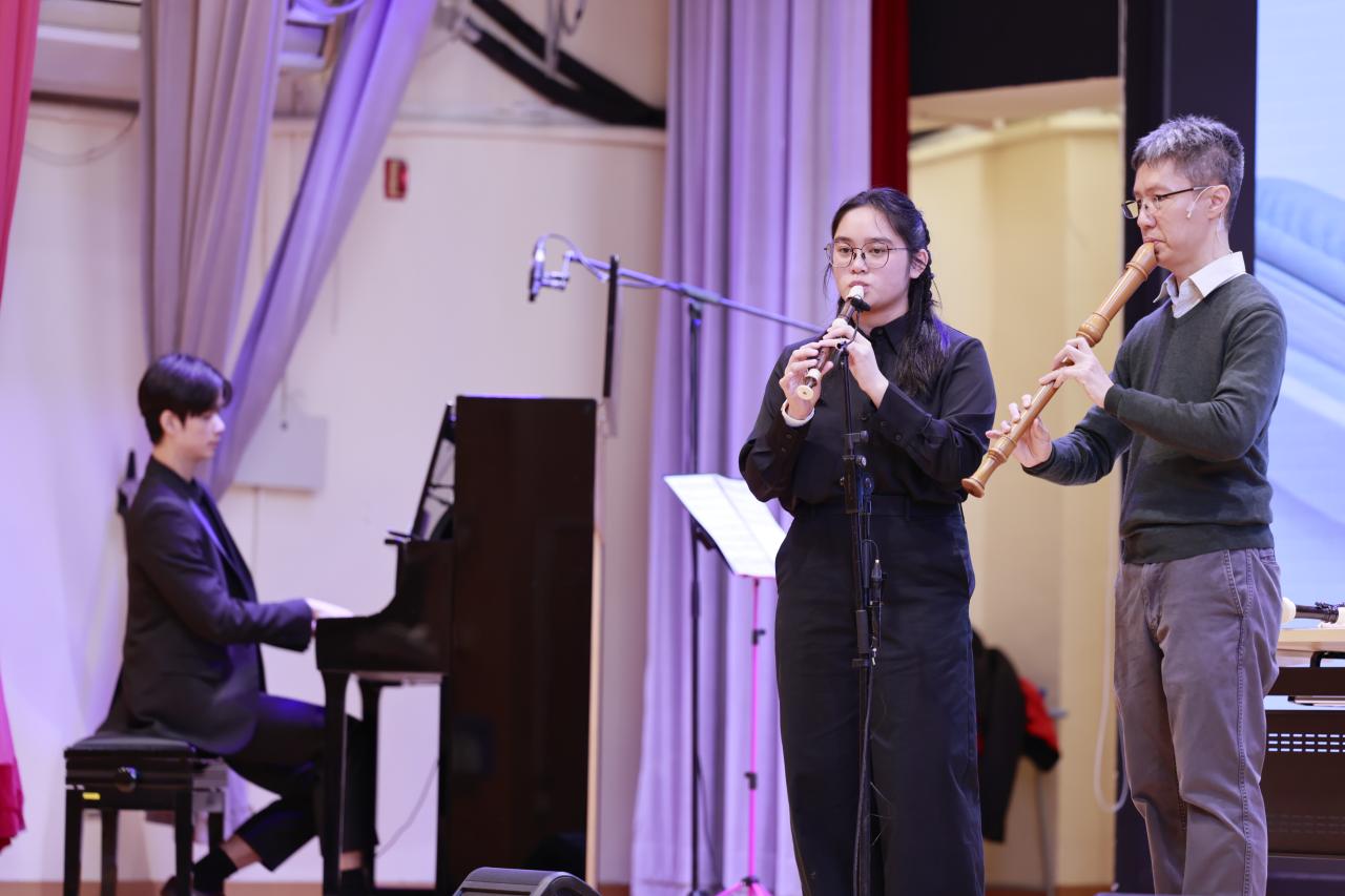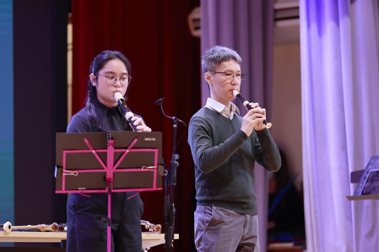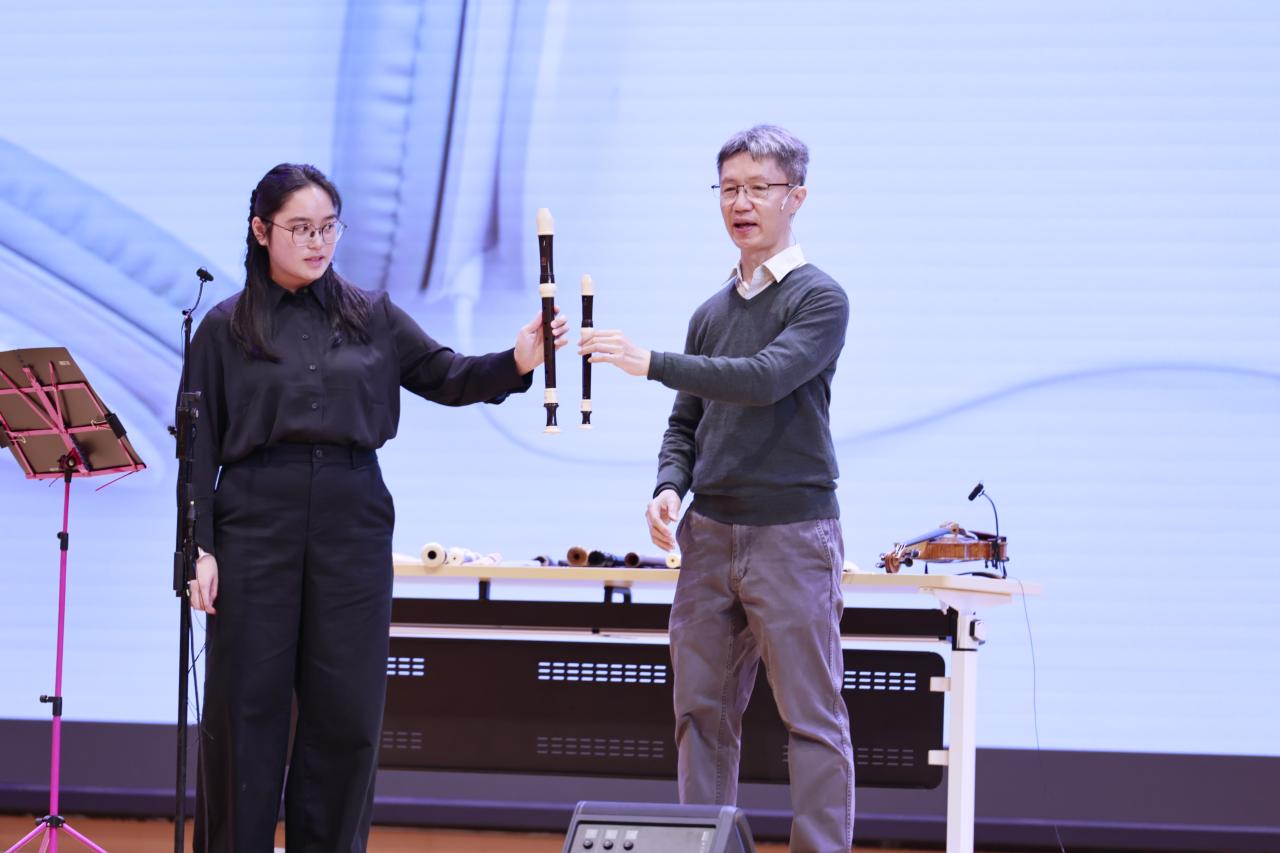 活動當日,我們榮幸邀請到香港教育大學音樂團隊及著名木笛音樂家劉思聰先生蒞臨。劉先生不僅帶來精彩的示範,更向同學展示了不同種類的木笛。從外型構造到音色的變化,劉先生深入淺出地介紹了木笛家族的獨特之處。當高亢清脆與低沉圓潤的笛聲交織迴盪於禮堂時,在場師生無不聽得入神,對這件樂器有了全新的認識與欣賞。隨後,香港教育大學音樂團隊帶領學生進行互動音樂體驗,引導同學們專注聆聽,在旋律中尋找共鳴。