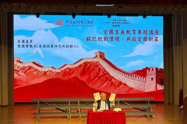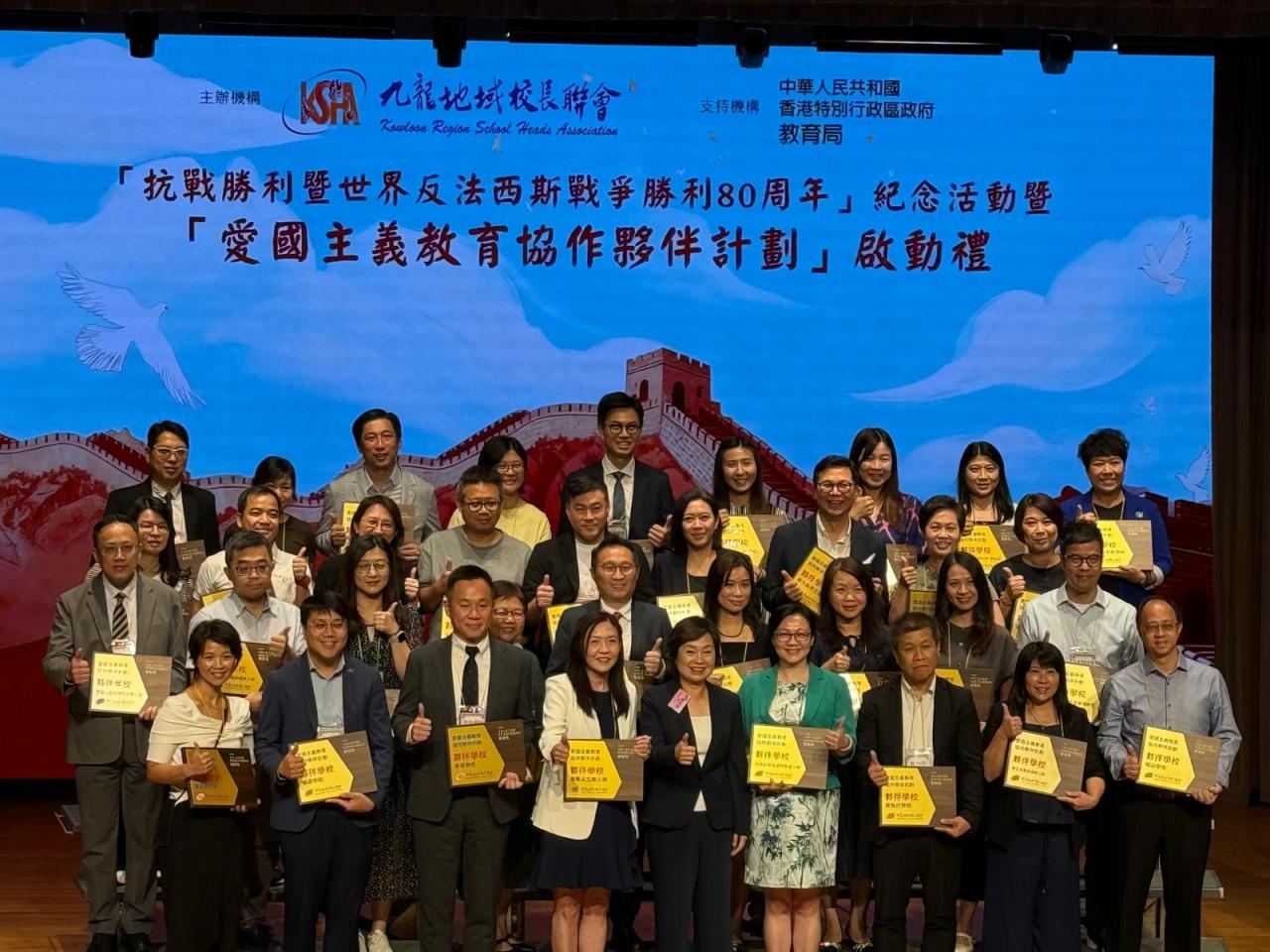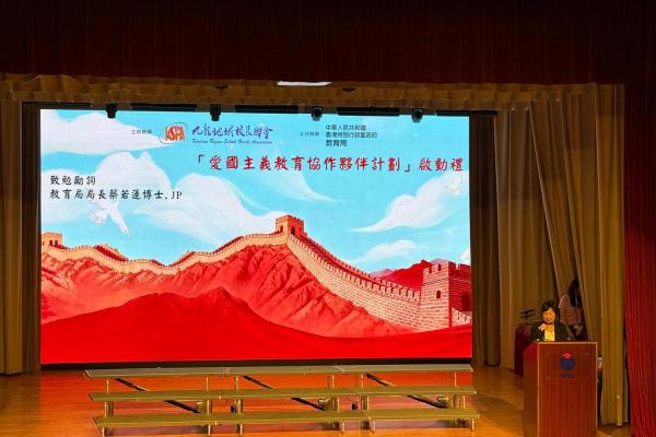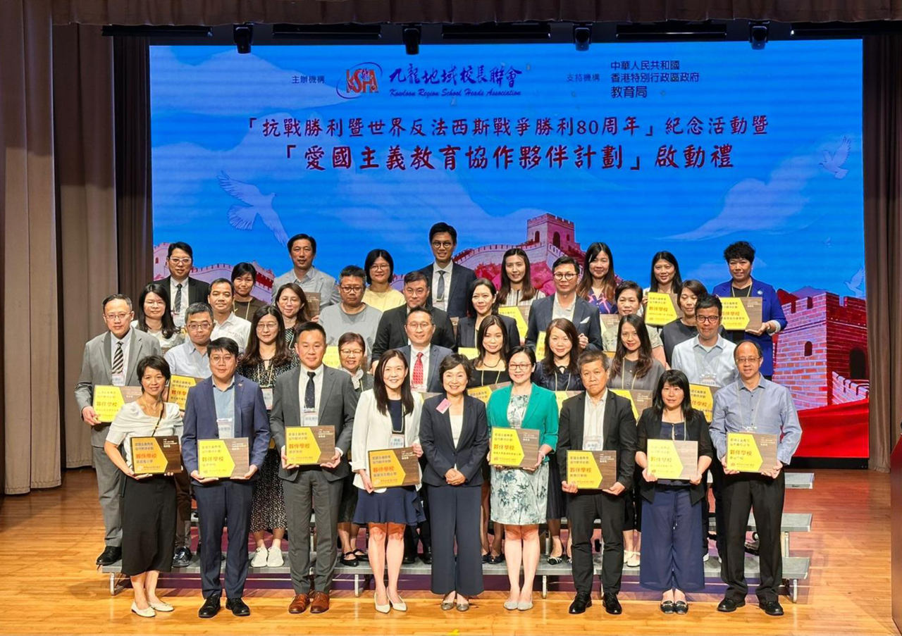 為配合國家推動愛國主義教育的重要方針,本校邱寶祺校長、陳志紅主任代表參加「抗戰勝利暨世界反法西斯戰爭勝利 80 周年」紀念活動,邱寶祺校長在「愛國主義教育協作夥伴計劃」啟動禮中,由教育局蔡若蓮局長JP頒發夥伴計劃獎座,以深化學校的愛國主義教育,培育學生的家國情懷為目標。