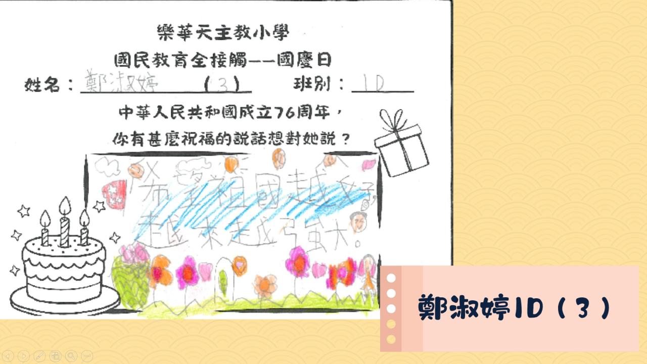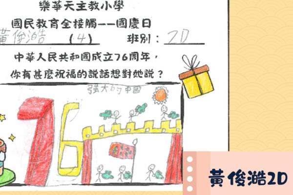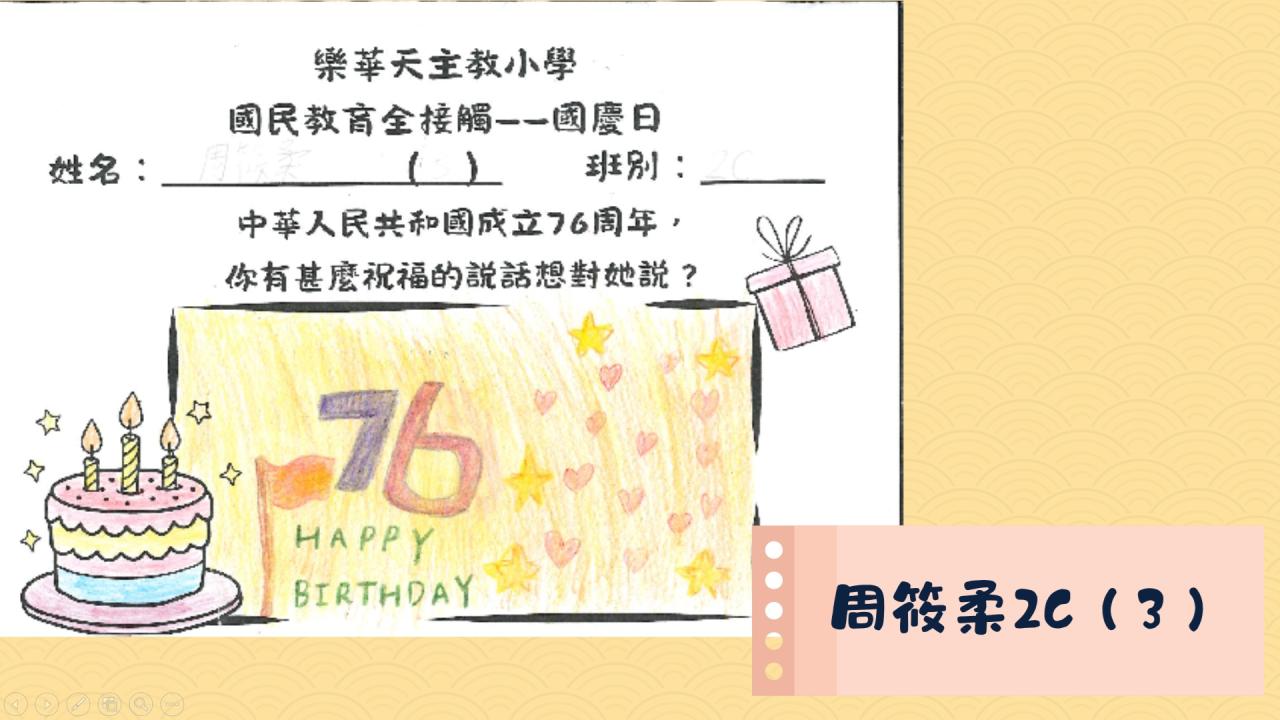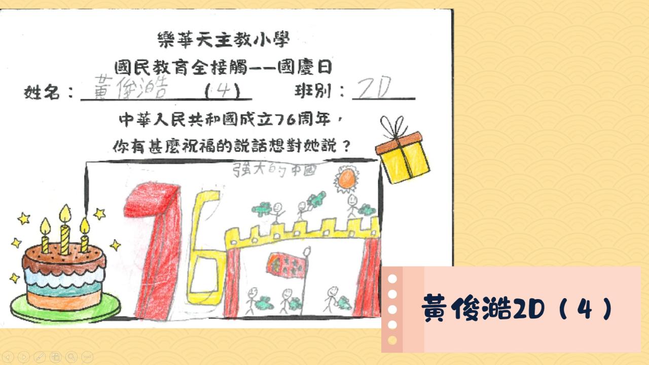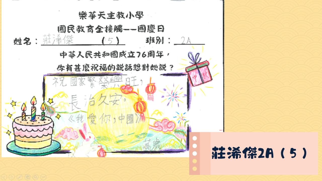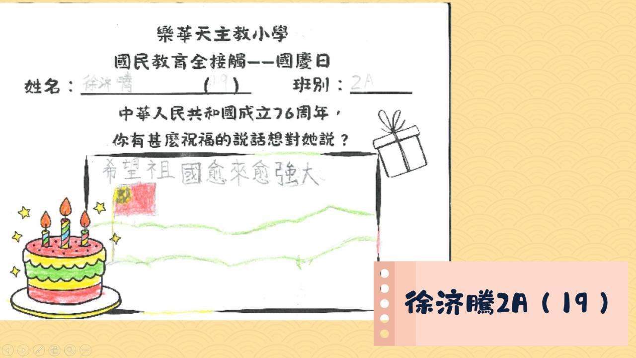 樂華天主教小學的同學們積極參與國民教育全接觸——「國慶日」活動,以圖文作品表達他們對祖國的感情和祝福,增強自我作為中國人的身份認同感。